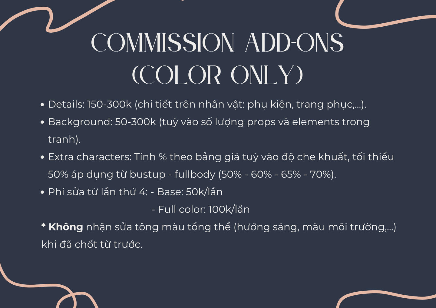 Thời hạn thanh toán: 2 ngày (cọc lần đầu), 2 ngày (sketch), 1 tuần (base) kể từ ngày mình gửi thông báo. Quá hạn nếu trước đó bạn không xin dời hạn thanh toán = huỷ comm (không refund tiền cọc 20% nếu đặt lần đầu). Bạn có thể xin dời hạn (không quá 3 ngày/sketch, không quá 1 tuần/base). Nếu vẫn quá hạn mình sẽ huỷ comm + 1 vé blacklist + CBGD công khai.